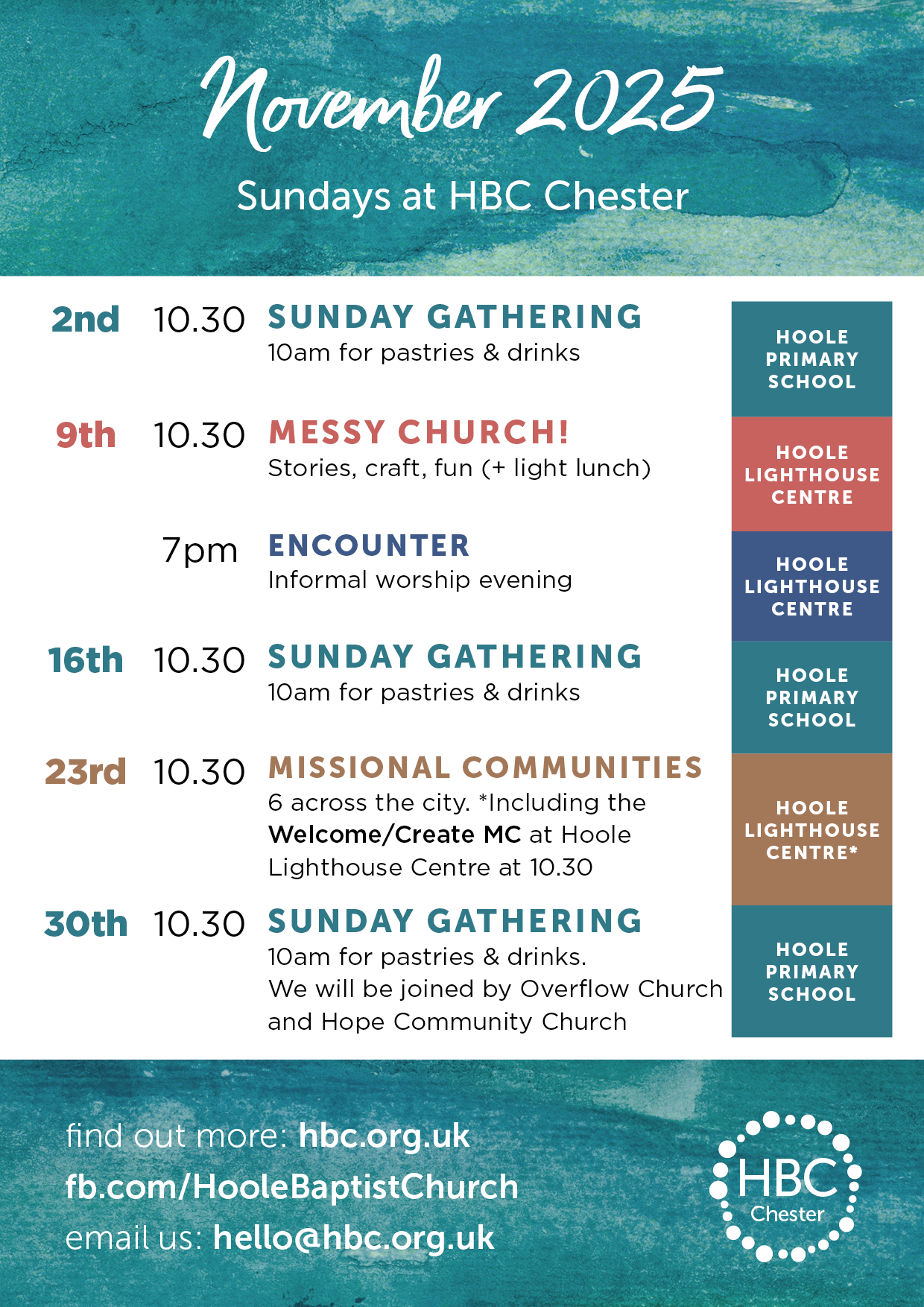 We gather as a whole church and in smaller groups called Missional Communities on Sundays (depending which week of the month it is), as well as running groups and events in the community during the week and from time to time.